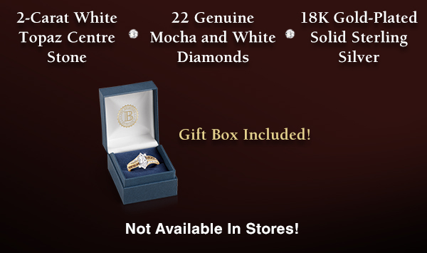 Solid sterling silver ring with 18K-gold plating, 22 genuine white and mocha diamonds, 2-ct. white topaz. Personalise free with 2 names. Gift box.